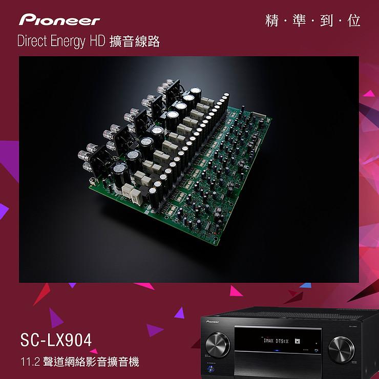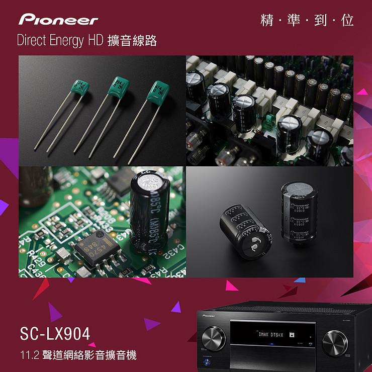 即使 Pioneer 在影音擴音機研發上有著成熟而獨特的技術傳承,Pioneer 音響工程師為求精益求精,於 SC-LX904 上嚴格挑選的全新音響級零件,完善極致精準的參考級音質。參照高級 SACD 播放機 PD-70AE 的高訊噪比和高精度轉換的開發經驗,SC-LX904 配備兩枚 ESS SABRE PRO ES9026PRO DAC 作全部聲道高達 384kHz / 24bit 的 D/A 轉換,帶來所有聲道同步對稱的高分析力解碼輸出。用上與日本 Shinyei Capacitor (神栄キャパシタ)共同開發的音響級全新定製薄膜電容,該薄膜電容器用於電源的整流器和 Direct Energy HD 功率擴大的濾波器,讓聲音表現更具細節音樂感。還採用全新的大型定製電容器,以加強低頻豐厚感。針對電子訊號產生的磁場干擾,運算放大器兩端的電極部分選用了新的非磁性鍍層電阻,有助提升模擬訊號音質。還有新設計定製的非磁性鍍金接線柱,可連接粗身蕉插及高級喇叭線,減低外在雜訊干擾,提升喇叭訊號的傳導表現。